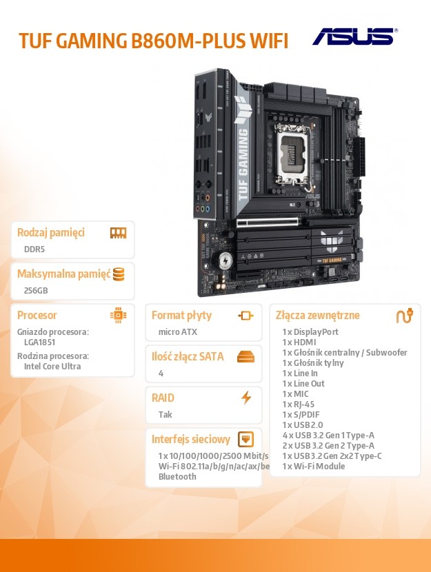 Płyta główna TUF GAMING B860M-PLUS WIFI to urządzenie, które wyróżnia się nie tylko solidnym wykonaniem, ale także doskonałymi parametrami, które spełnią oczekiwania nawet najbardziej wymagających użytkowników. Dzięki zastosowaniu gniazda procesora LGA1851 oraz obsłudze procesorów z rodziny Intel Core Ultra, zapewnia ona niezawodność i wydajność działania.