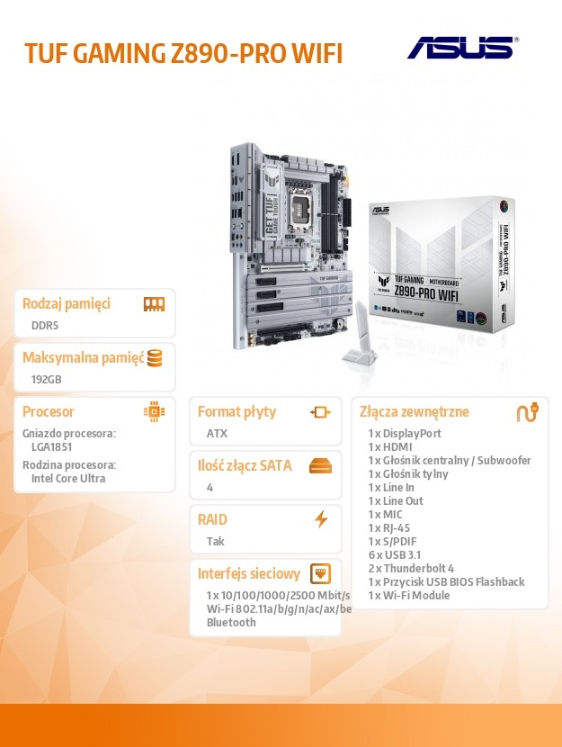 ASUS TUF GAMING Z890-PRO WIFI wykorzystuje wszystkie niezbędne elementy najnowszych procesorów Intel Core Ultra (seria 2) i łączy je z funkcjami gotowymi do gry i sprawdzoną wytrzymałością. Zaprojektowana z komponentów klasy wojskowej, ulepszonym rozwiązaniem zasilania i kompleksowym systemem chłodzenia, ta płyta główna przekracza oczekiwania dzięki solidnej i stabilnej wydajności podczas maratonów grania. Płyty główne TUF GAMING przechodzą również rygorystyczne testy wytrzymałościowe, aby upewnić się, że poradzą sobie w warunkach, w których inne mogą zawieść. Ta platforma zapewnia moc i łączność, których wymagają zaawansowane aplikacje komputerowe AI.