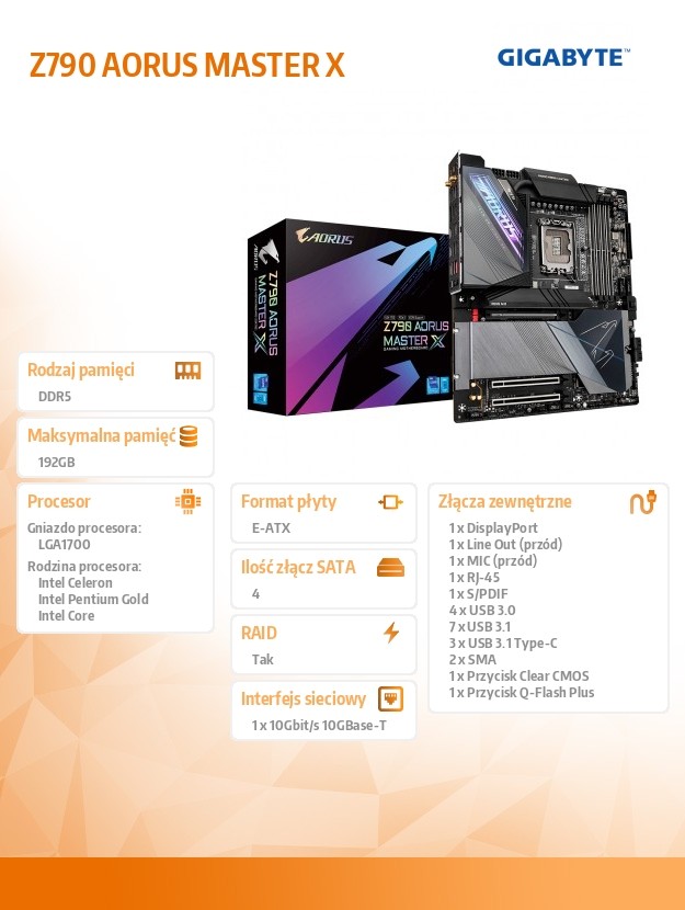 Z790 AORUS MASTER X Obsługuje procesory Intel Core 14 i 13 Cyfrowe bezpośrednie rozwiązanie VRM 20+1+2 faz Dwukanałowa pamięć DDR5: 4*DIMM z obsługą modułów pamięci XMP 3.0 PCIe UD Slot X: Gniazdo PCIe 5.0 x16 o 10-krotnie większej wytrzymałości dla karty graficznej EZ-Latch Click: Radiatory M.2 o konstrukcji bezśrubowej EZ-Latch Plus: gniazdo PCIe 5.0 x16 i gniazda M.2 z konstrukcją szybkiego zwalniania UC BIOS: Intuicyjny interfejs użytkownika zorientowany na użytkownika z funkcją szybkiego dostępu Ultraszybka pamięć masowa: 5* gniazd M.2, w tym 1* PCIe 5.0 x4 Wydajna ogólna ochrona termiczna: układ żeberek pancerza termicznego VRM i osłona termiczna M.2 XL Szybka sieć: 10GbE LAN i Wi-Fi 7 z anteną o ultrawysokim wzmocnieniu Rozszerzona łączność: DP, przedni port USB-C 10 Gb/s, przedni i podwójny tylny port USB-C 20 Gb/s DTS:X Ultra Audio: ALC1220 i tylny przetwornik cyfrowo-analogowy ESS SABRE Hi-Fi 9118