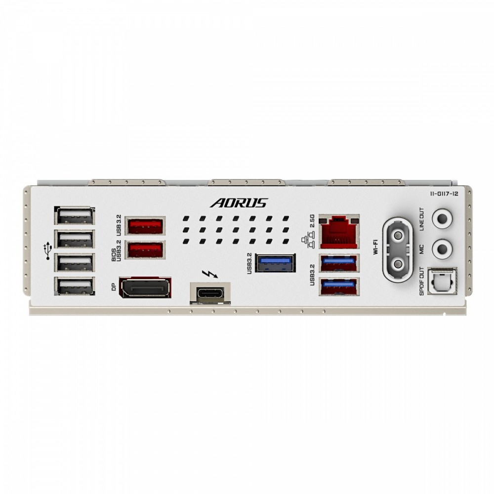 Złącza zewnętrzne: 4 x USB 2.0, 1 x Thunderbolt 4, 2 x USB 3.2 Gen 2 Type-A, 3 x USB 3.2 Gen 1 Type-A, 1 x Line Out (zielony / headphones), 1 x MIC (różowy / microphone), 1 x RJ-45, 1 x DisplayPort, 1 x S/PDIF, 2 x SMA
