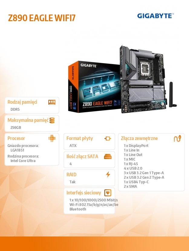 Z890 EAGLE WIFI7 Obsługa procesorów Intel Core Ultra (seria 2) Cyfrowe, podwójne rozwiązanie VRM 14+1+2 faz D5 Bionic Corsa zapewniająca nieskończoną wydajność pamięci AORUS AI SNATCH: Oprogramowanie do automatycznego overclockingu według modelu AI AI PerfDrive: zapewnia użytkownikom optymalny i dostosowany profil BIOS-u Zgodność Premium: 4*DDR5 z obsługą modułów pamięci XMP Wtyczka WIFI EZ: Szybki i łatwy projekt instalacji anteny Wi-Fi EZ-Latch Plus: Gniazda PCIe i M.2 z szybkozłączką i konstrukcją bezśrubową EZ-Latch Click: radiatory M.2 w wersji bezśrubowej Przyjazny interfejs użytkownika: obsługa wielu motywów, sterowanie wentylatorami AIO i automatyczne skanowanie Q-Flash w systemie BIOS i oprogramowaniu Nowy monitor zasilania w HWinfo do monitorowania w czasie rzeczywistym faz zasilania procesora Ultraszybka pamięć masowa: 4 gniazda M.2, w tym 1 PCIe 5.0 x4 Wydajne chłodzenie: VRM Thermal Armor Advanced i M.2 Thermal Guard Szybka sieć: 2,5 GbE LAN i Wi-Fi 7 Rozszerzona łączność: USB4 Type-C z DP-Alt, DisplayPort Gniazdo PCIe UD X: gniazdo PCIe 5.0 x16 o 10-krotnej mocy dla karty graficznej