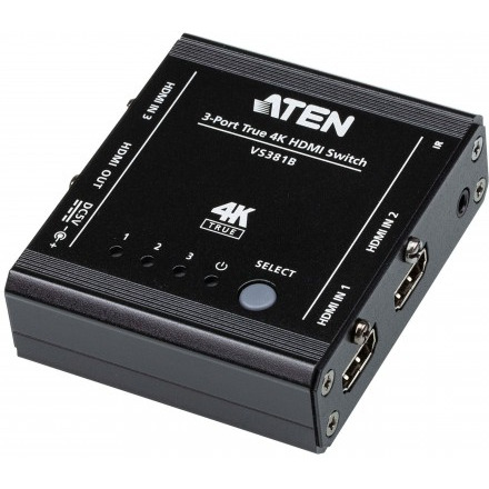 VS381B True 4K z funkcją automatycznego przełączania umożliwia przełączanie 3 źródeł wejściowych HDMI na wyświetlacz HDMI. Obsługuje rozdzielczości wideo do True 4K (4096 x 2160 przy 60 Hz 4: 4: 4), szybkości transmisji danych do 18 Gb / s, HDR, 3D, Deep Color i bezstratne formaty audio HD.