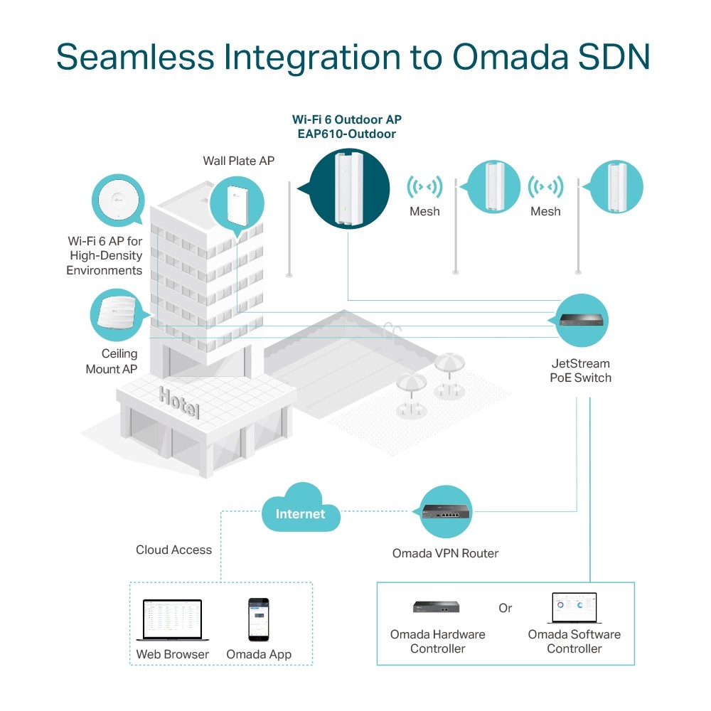 Platforma Omada Software Defined Networking (SDN) integruje ze sobą urządzenia sieciowe takie jak Punkty dostępowe, przełączniki i routery aby zapewnić w 100% scentralizowane zarządzanie w chmurze i wysoce skalowalną sieć zarządzaną z jednego interfejsu.