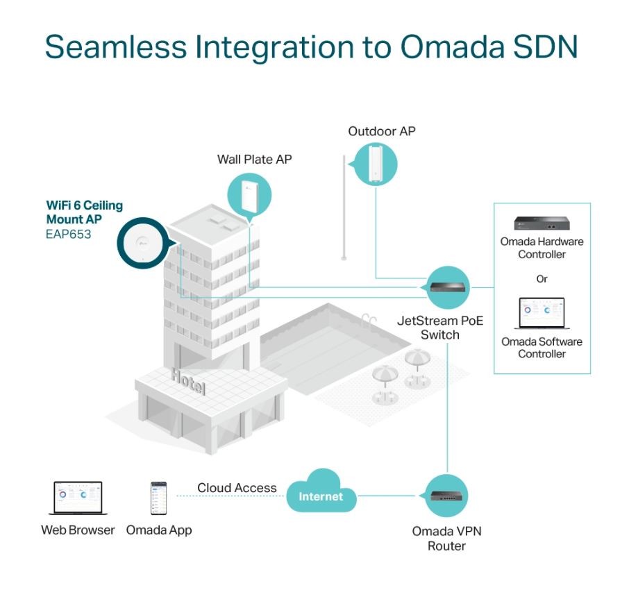 Gigabitowy, dwupasmowy, bezprzewodowy punkt dostępowy z możliwością montażu na suficie, standard AX3000 Błyskawiczne prędkości w standardzie Wi-Fi 6: Jednoczesna obsługa prędkości dochodzących do 574 Mb/s w paśmie 2,4 GHz i 2402 Mb/s w paśmie 5 GHz, co daje łącznie nawet 2976 Mb/s. Wysoka wydajność WiFi 6: Więcej połączonych urządzeń może korzystać z wyższej prędkości. Scentralizowane zarządzanie w Chmurze: Integracja z platformą Omada SDN pozwala na zarządzanie siecią lokalnie i zdalnie z Chmury przez interfejs Web lub aplikację Omada. Szerokość kanału 160 MHz: Podwojona ilość danych szczytowej transmisji na jednym strumieniu dzięki HE160. Płynny roaming: Transmisje wideo i trwające połączenia głosowe nie są przerywane, gdy użytkownicy zmieniają lokalizację.§ Omada Mesh: Możliwość bezprzewodowego łączenia się punktów dostępowych w celu utrzymania dużego zasięgu sieci i dowolności lokalizacji.§ Obsługa zasilania PoE+: Dobór lokalizacji dla urządzenia oraz jego montaż nie przysparzają większych trudności dzięki obsłudze zasilania PoE+ (w standardzie 802.3at) oraz zasilania DC (brak zasilacza w zestawie).