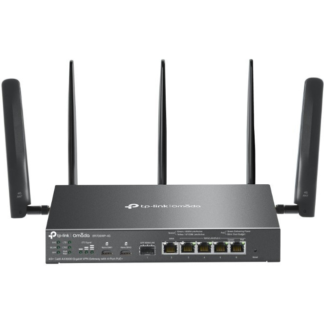 Brama sieciowa gigabitowa Omada 4G+ Cat6 AX3000 VPN with 4-Port PoE+PORT: 1× Gigabit SFP WAN/LAN Port, 1× Gigabit RJ45 WAN Port, 4× Gigabit WAN/LAN