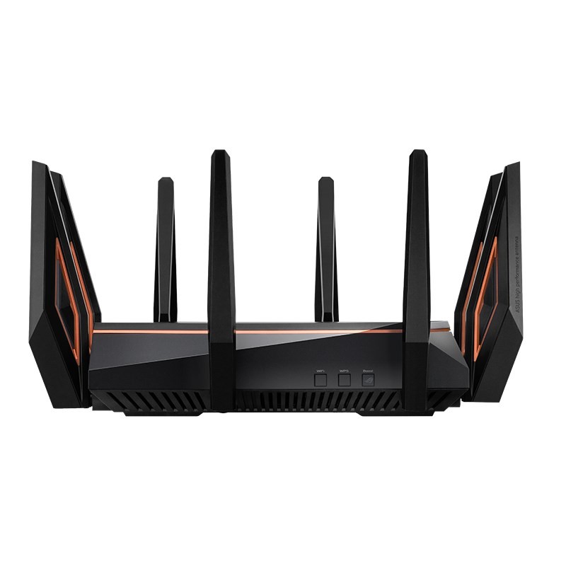 Trzyzakresowy router gamingowy typu AX11000 pracujący w standardzie Wi-Fi 6 (802.11ax) Pierwszy na świecie router Wi-Fi klasy 10-gigabitowej, wyposażony w czterordzeniowy procesor, gniazdo gamingowe 2.5G, funkcję DFS, wtfast, Adaptive QoS, AiMesh do systemów bezprzewodowych typu mesh oraz pakiet zabezpieczeń sieciowych AiProtection Pro.