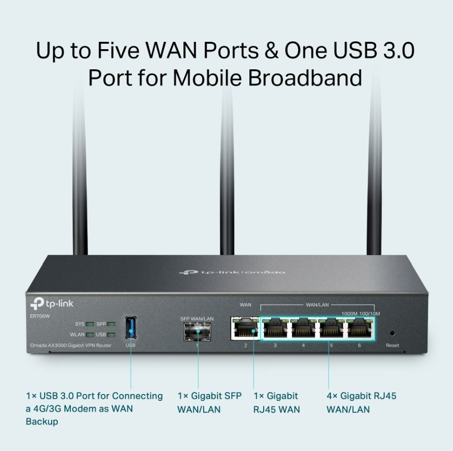 ER706W Gigabitowy router VPN Omada, standard AX3000 Dwupasmowe WiFi AX3000: Do 2402 Mb/s w paśmie 5 GHz i do 574 Mb/s w paśmie 2,4 GHz. 6 Gigabitowych portów Ethernet: 1 gigabitowy port SFP i 5 gigabitowych portów RJ45 zapewnia wysoką prędkość połączeń przewodowych. Omada Mesh: Płynne łączenie punktów dostępowych EAP wspierających technologię Mesh. Centralne zarządzanie: Dostęp z poziomu Chmury i aplikacji Omada to wygoda zarządzania. Duży zasięg: Trzy zewnętrze anteny zwiększaja i koncentrują sygnał Wi-Fi. Bezpieczna sieć VPN: Router obsługuje wiele protokołów VPN, włączając IPSec / SSL / Wireguard / PPTP / L2TP VPN, ułatwiając użytkownikom nawiązywanie połączeń zdalnych. Niezawodne zabezpieczenia: Firewall, Ochrona przed atakami DoS, Filtrowanie adresów IP/MAC/URL i jeszcze więcej funkcji chroniących Twoją sieć i dane.