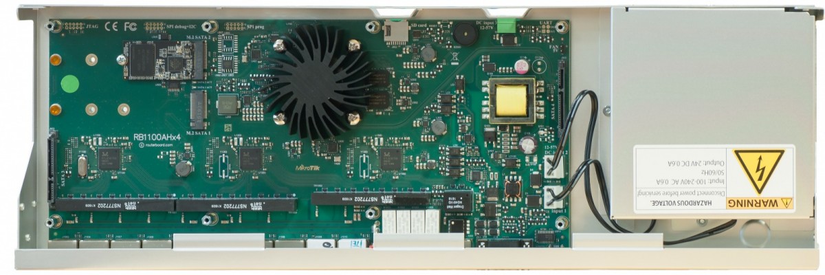 Jednostka jest dostarczana z obudową do montażu w szafie rack 1U, 13 portami Gigabit Ethernet, portem szeregowym RS232 i dwoma redundantnymi zasilaczami. Wersja RB1100AHx4 Dude jest wyposażona w kilka szybkich złączy pamięci masowej (dwa SATA i dwa M.2). Zawiera już zainstalowany dysk M.2 o pojemności 60 GB.