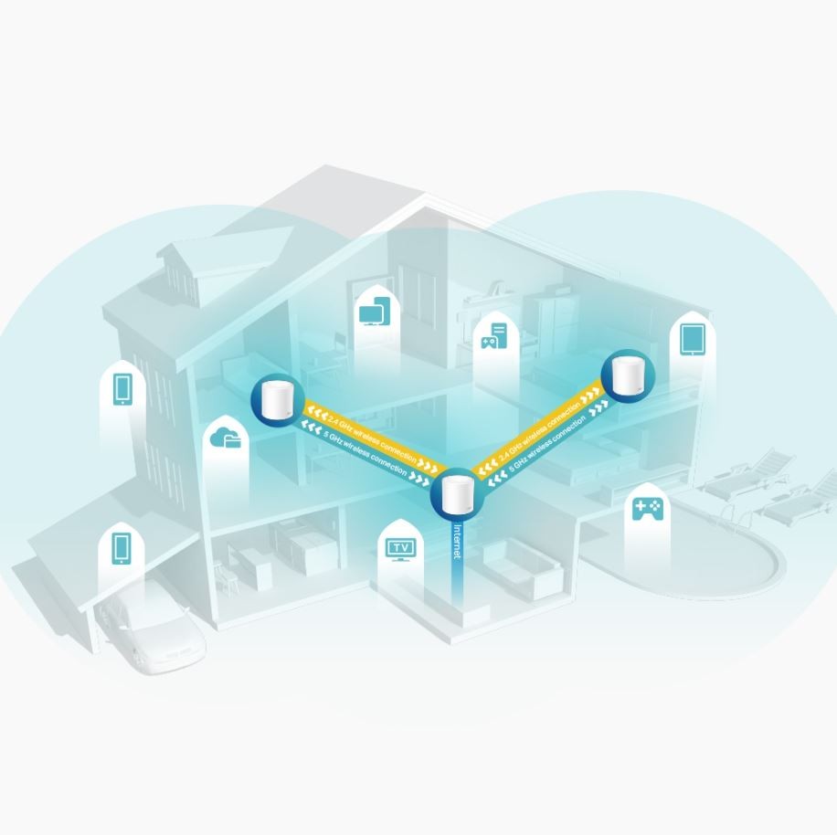 Technologia TP-Link Mesh sprawia, że routery Deco współpracują ze sobą, aby tworzyć jednolitą sieć Wi-Fi. Podczas przemieszczania się po domu twój telefon lub tablet zawsze połączy się z routerem Deco, który oferuje mu najlepsze połączenie, bez przerywania transferu.