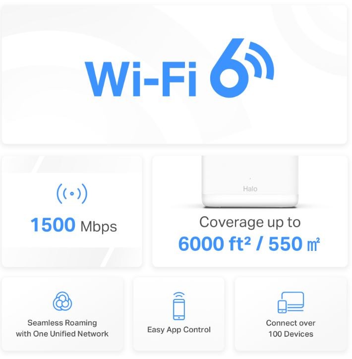 Dwuzakresowe Wi-Fi 6 z szybkością do 1500 Mb/s - 1201 Mb/s w paśmie 5 GHz i 300 Mb/s w paśmie 2,4 GHz. Bezproblemowy roaming w jednej zunifikowanej sieci - jednostki Halo współpracują ze sobą, aby automatycznie przełączać się między systemami Halo podczas poruszania się po domu za pomocą jednej, ujednoliconej nazwy Wi-Fi i hasła. Połącz ponad 100 urządzeń - zapewnij szybkie i stabilne połączenia ponad 100 urządzeń. Łatwe zarządzanie siecią domową - użyj aplikacji, aby szybko skonfigurować i zarządzać siecią Wi-Fi. Możesz także zarządzać czasem i treściami online swoich dzieci. Pełne porty Gigabit - porty Gigabit do błyskawicznych połączeń przewodowych.
