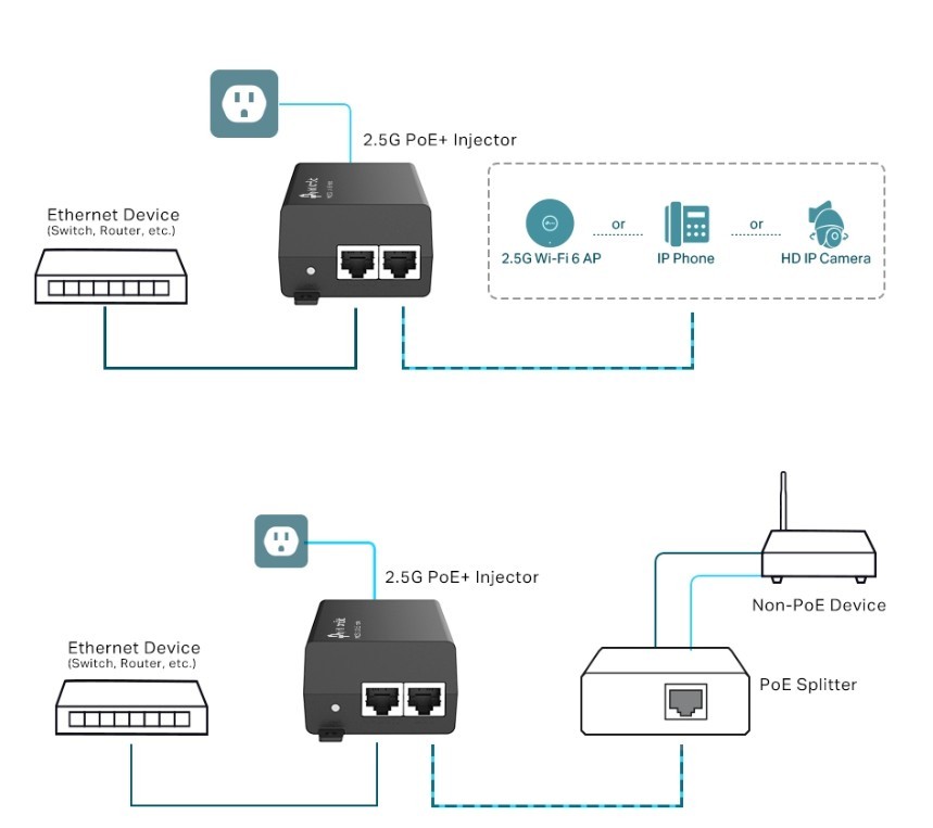Injector PoE+ 2,5G 2 porty 2,5Gb/s zapewniają szybką transmisję danych Zgodność ze standardami IEEE802.3af/at, do 30W Redukcja kosztów infrastruktury poprzez przesył danych i zasilania jednym przewodem Ethernet Automatycznie dostosowuje zasilanie do wymagań podłączonego urządzenia Możliwość montażu na ścianie i biurku Instalacja "Plug & Play", nie wymaga konfiguracji Zintegrowany zasilacz