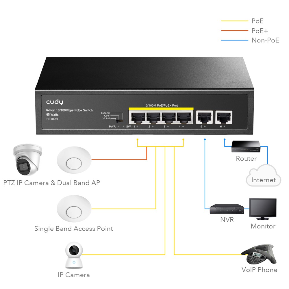 FS1006P 6-portowy przełącznik 10/100M PoE+ Zgodny ze standardem IEEE802.3af/at Obsługuje moc PoE do 32 W dla każdego portu PoE Automatyczne wykrywanie urządzeń innych niż PoE i urządzeń PoE Priorytet zasilania gwarantuje zasilanie kluczowych węzłów Przełącznik trybu CCTV/VLAN, zdalne zasilanie i dane do 250m Obsługuje sterowanie przepływem IEEE802.3 x full duplex / half duplex