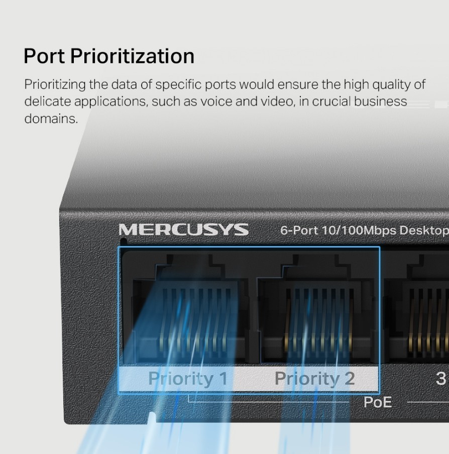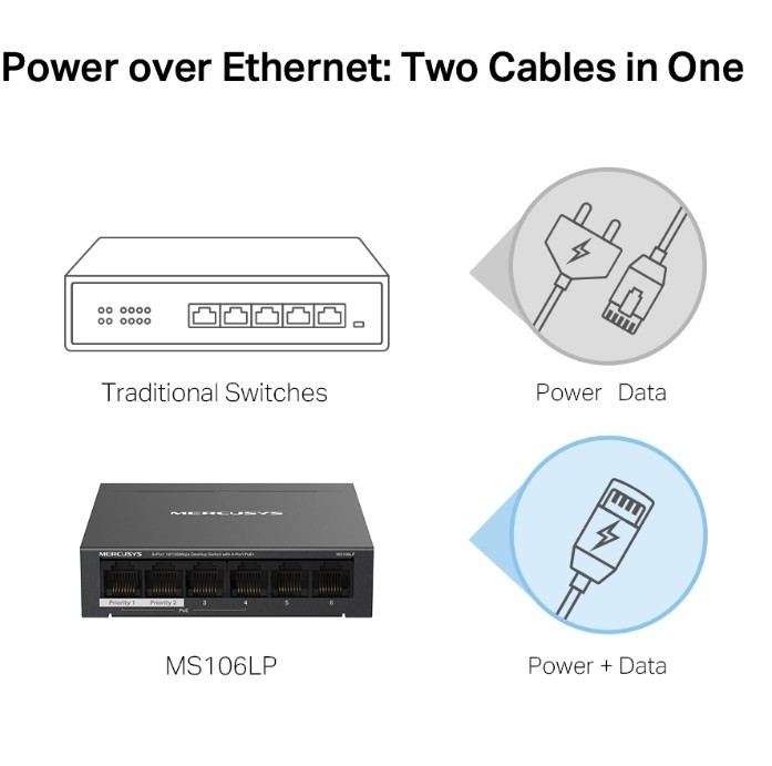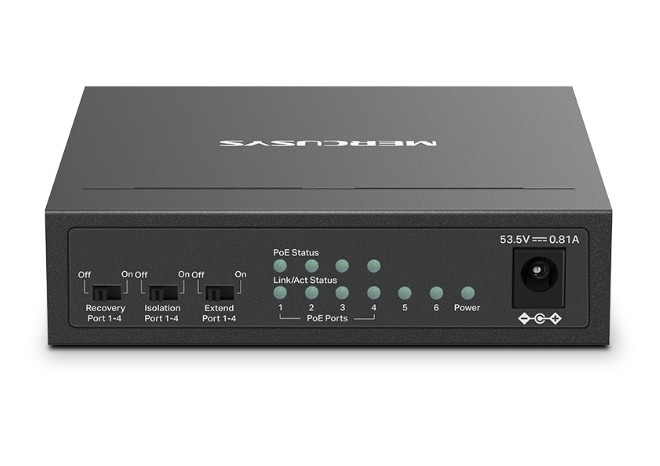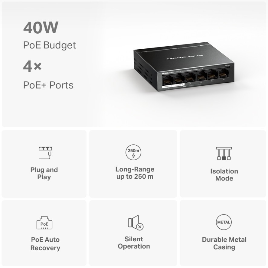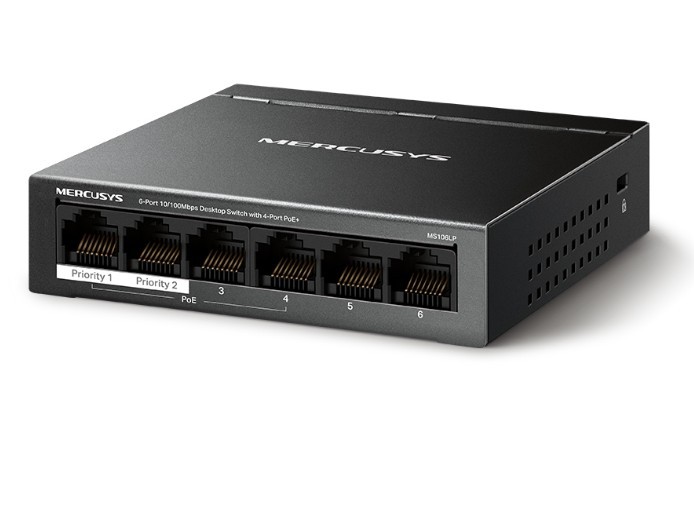 Przełącznik Mercusys 6-Port 10/100 Mbps Desktop Switch with 4-Port PoE+ PORT: 4× 10/100 Mbps PoE+ Ports, 2× 10/100 Mbps Non-PoE Ports MS106LP