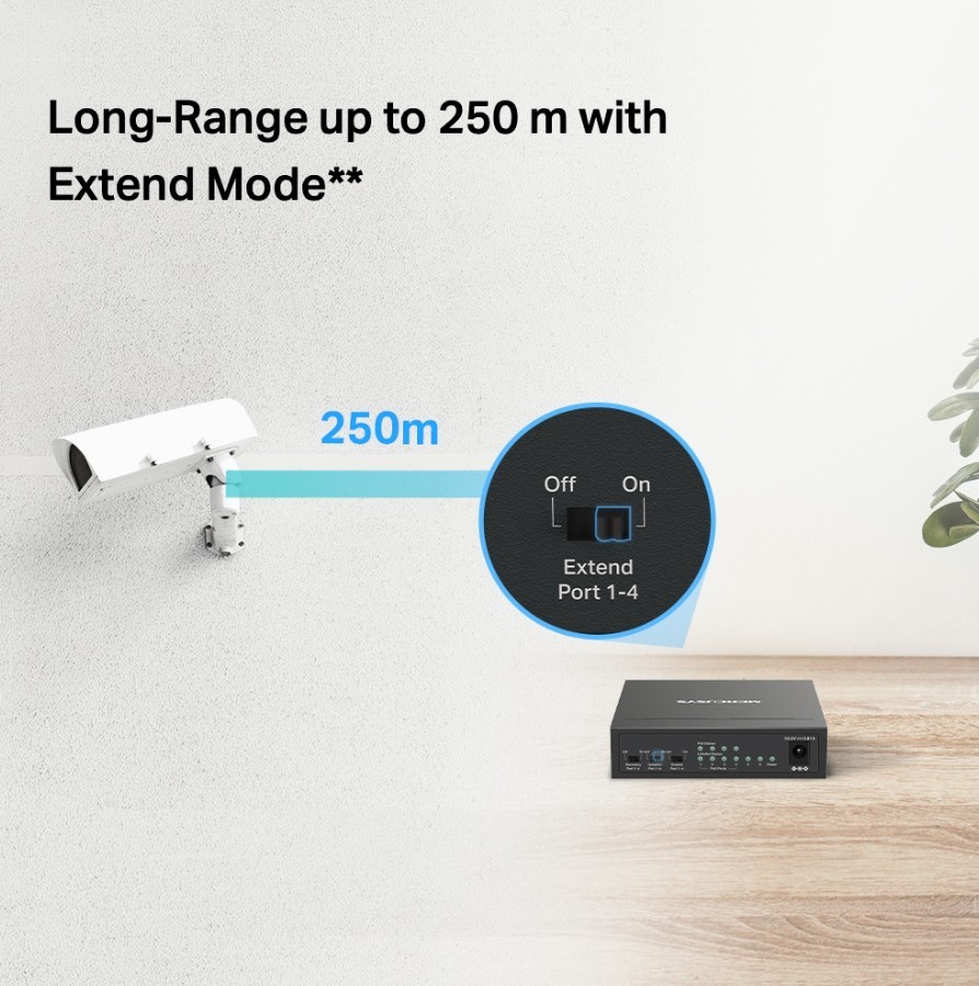 Przełącznik typu Desktop, 6 portów 10/100Mb/s, w tym 4 porty PoE+ 6 Portów: 6 portów RJ45 10/100Mb/s w tym 4 porty PoE+ Dwa kable w jednym: 4 porty PoE+ umożliwiające zasilanie i przesyłanie danych za pomocą pojedynczych kabli PoE+: Zasilanie PoE o mocy do 30 W na każdym porcie PoE i do 40W łącznej mocy PoE na wszystkich portach PoE 2 porty Uplink: MS106LP zapewnia 2 porty uplink po włączeniu trybu izolacji. Jeden do połączenia z Internetem i jeden do połączenia z NVR. Zasięg transmisji do 250m: Do 250 m zasięgu transmisji danych i zasilania w trybie Extend Tryb Isolation: Oddziela ruch portów za pomocą jednego kliknięcia, w celu zwiększenia stabilności i bezpieczeństwa sieci Wysoka kompatybilność: Zgodność z urządzeniami obsługującymi standardy IEEE 802.3af/at. Wytrzymała metalowa obudowa: Wydajne odprowadzanie ciepła i długi czas pracy sieci Plug and Play: Wystarczy podłączyć kabel, aby uzyskać natychmiastowe połączenie PoE Auto Recovery: Automatycznie restartuje zrzucone lub niereagujące urządzenia zasilane przez PoE.