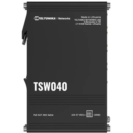 TSW040 to niezarządzalny 8-portowy przełącznik PoE+ firmy Teltonika, wyposażony w osiem portów RJ45 o całkowitym budżecie mocy 240 W lub do 30 W na port. Ten kompaktowy i wytrzymały 8-portowy przełącznik jest również wyposażony w 2-pinowe wejście zasilania i zintegrowaną szynę DIN ułatwiającą montaż, dzięki czemu idealnie nadaje się do zastosowań przemysłowych. TSW040 ma szeroki zakres napięć 757 VDC i zakres napięcia wyjściowego PoE 4457 VDC.