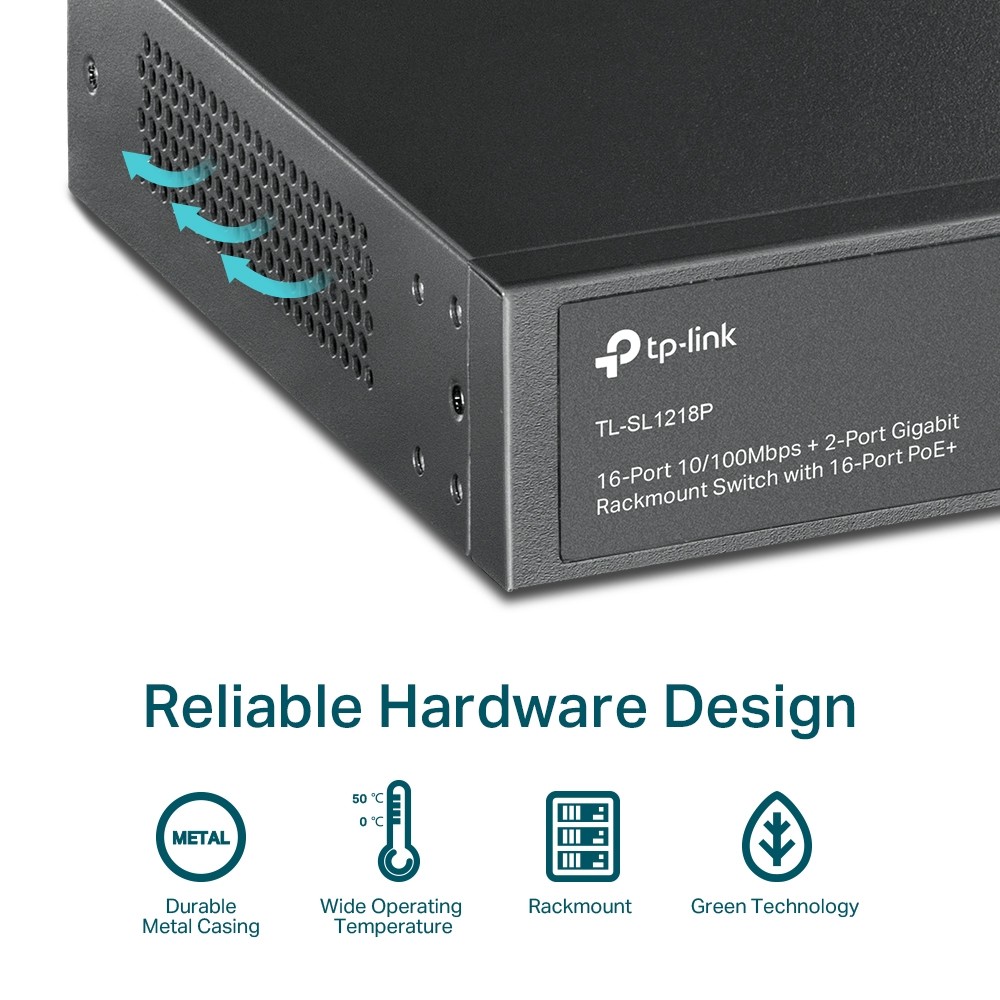 TL-SL1218P Przełącznik do montażu w szafie rack, 16 portów 10/100 Mb/s PoE+, 2 porty gigabitowe 16 portów RJ45 10/100 Mb/s PoE+, 2 gigabitowe porty RJ45, 1...
