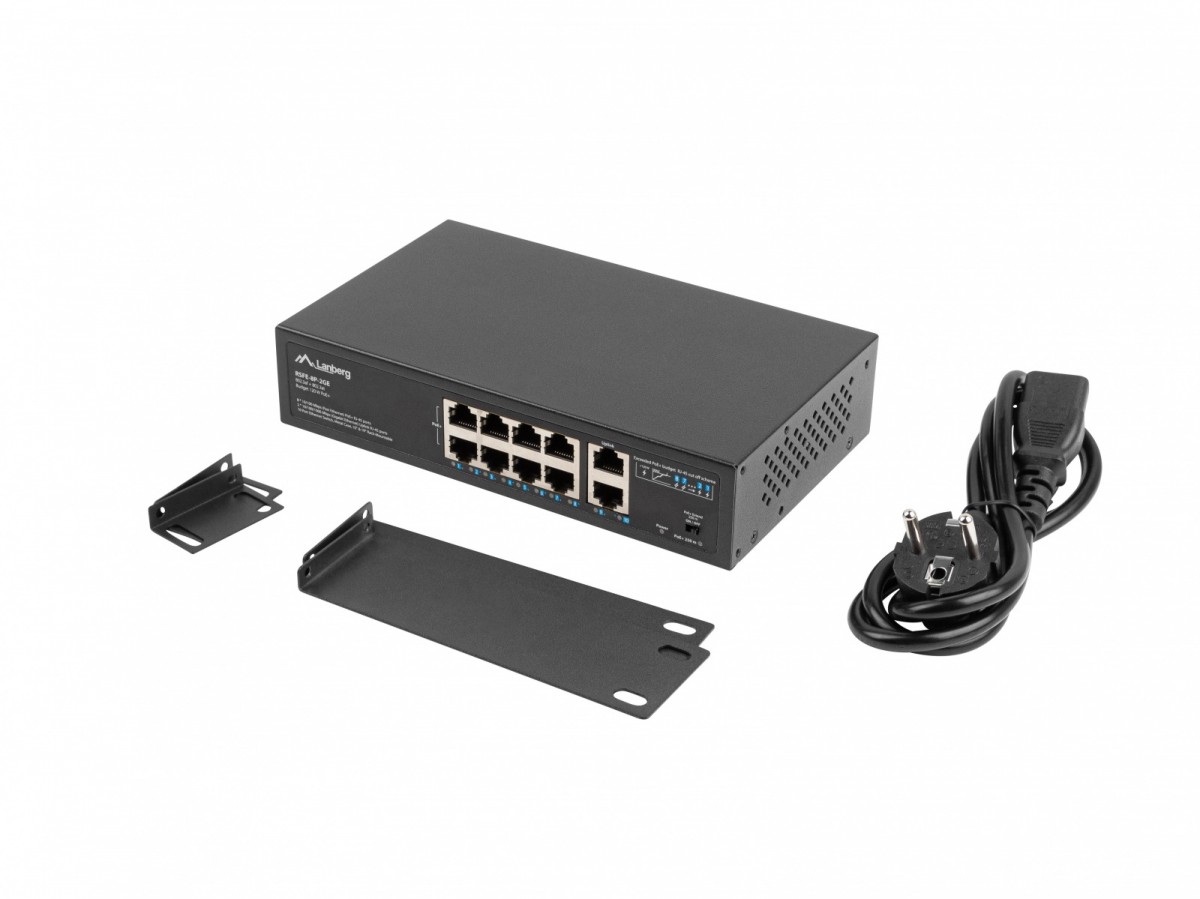 Switch został wyposażony łącznie w 10 portów, w tym 8 portów PoE+ oraz 2 Uplink. Przemyślana konstrukcja i dbałość o jakość komponentów zapewnia użytkownikowi aż do 120 W całkowitej realnej mocy dla urządzeń końcowych, co oznacza możliwość podłączenia równocześnie: 8 urządzeń w standardzie IEEE 802.3af (max. 15 W per port) lub, 4 urządzeń w standardzie IEEE 802.3at (max. 30 W per port)