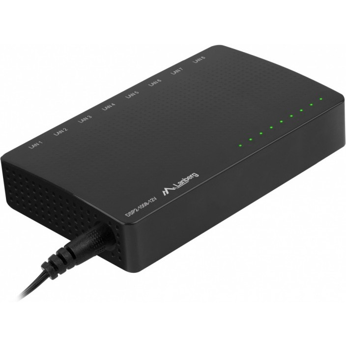 Lanberg DSP2-1008 to niewielkich rozmiarów niezarządzalny desktopowy przełącznik, wyposażony w 8 portów Gigabit Ethernet. Urządzenie jest niewielkie i poręczne oraz działa na zasadzie Plug&Play. Przełącznik zapewnia wsparcie funkcji przełączania dla 8 portów RJ-45 10/100/1000 Mbps wraz z automatyczną negocjacją połączenia oraz obsługą MDI-MDIX.