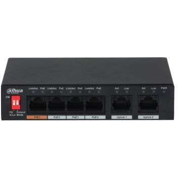 6-portowy niezarządzalny przełącznik biurkowy 10/100Mb/s z 4 portami PoE. Zapewnia 4 10/100 Mbps porty Ethernet i 2 porty uplink 10/100 Mb/s. Produkt jest wyposażony w dwa rodzaje trybów transmisji (Extend Mode On/Extend Mode Off). Obsługuje również funkcję watchdog PoE, aby uniknąć ręcznej konserwacji i ponownego uruchomienia urządzenia, które może realizować inteligentne zarządzanie i zmniejszać koszt.