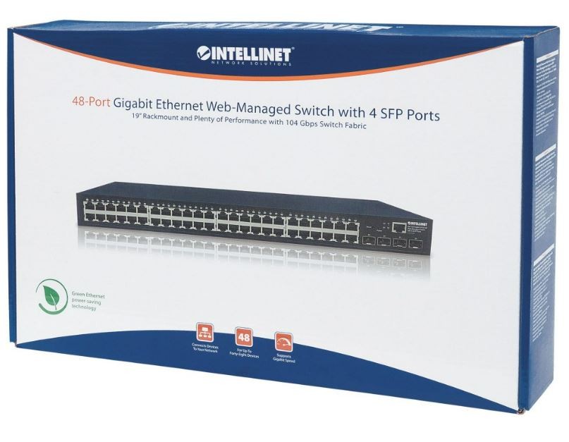 Akcesoria w zestawie: 48-Portowy Zarządzalny Przełącznik Gigabit Ethernet z 4 Slotami SFP Kabel zasilający Instrukcja użytkownika Uchwyty mocujące 19"