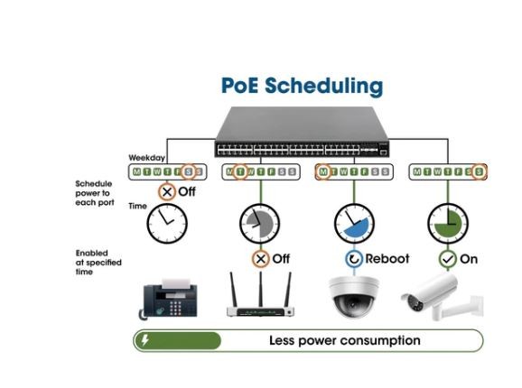 Pozostałe parametry: Umożliwia zasilanie oraz transmisję danych maksymalnie do 16 urządzeń sieciowych PoE Zapewnia oszczędność czasu oraz pieniędzy dzięki wykorzystaniu istniejących przewodów sieciowych do zasilania oraz transmisji danych Funkcja Powered Device Monitor (PDM) uruchamia ponownie każde podłączone urządzenie PoE, które nie odpowiada lub nie wysyła informacji o ruchu sieciowym. Kompatybilny z oprogramowaniem Domotz (może wymagać aktualizacji) Porty 10/100/1000 z automatycznym wykrywaniem optymalnej prędkości sieci Wyposażony w dwa sloty (SFP) na moduły GBIC Porty wyjściowe RJ45 PoE/PoE+ zgodne z IEEE 802.3at/af Współpraca z urządzeniami PoE zgodnymi z IEEE 802.3at oraz 802.3af (bezprzewodowe punkty dostępowe, telefony VoIP, kamery sieciowe) Obsługa detekcji standardu IEEE 802.3 at/af oraz ochrona przed zwarciem, przeciążeniem i zbyt wysokim napięciem Wszystkie porty RJ45 posiadają auto-krosowanie MDIX oraz auto-negocjację NWay Zgodny ze specyfikacją IEEE 802.3az (Energy Efficient Ethernet EEE) Możliwość wyłączenia opcji IEEE 802.3az (Energy Efficient Ethernet EEE) Konfiguracja funkcji PoE, w tym zarządzanie PoE na porcie, priorytet, aktywacja z opóźnieniem, harmonogram PoE, restart, monitoring PoE Zarządzanie SNMP oraz zdalny monitoring RMON Protokół SNMP V1, V2C, V3; obsługa 4 grup RMON 1, 2, 3 & 9 Obsługa protokołów IPv4/v6 Obsługa VLAN w oparciu o tagi lub porty (tag-based, port-based) Uwierzytelnianie IEEE 802.1x w oparciu o porty Agregacja portów (trunking) Zarządzanie przepustowścią dla wszystkich portów Obsługa trybu "port mirroring" Obsługa dwóch typów QoS: w oparciu o porty oraz DSCP Funkcja "Broadcast storm control" z możliwością ustawiania przepływu pakietów "multicast" Obsługa protokołów Rapid Spanning Tree/Spanning Tree Przełącznik w architekturze Store and Forward Tryby full/half duplex Obsługa kontroli przepływu IEEE 802.3x w trybie full duplex Konfiguracja poprzez przeglądarkę Internetową, Telnet lub SSH Zdalny Restart Diody sygnalizacyjne: zasilanie, link /aktywność oraz PoE Dwa wentylatory o wysokiej wydajności zapewniają idealną wentylację W pełni zgodny z ustawą NDAA