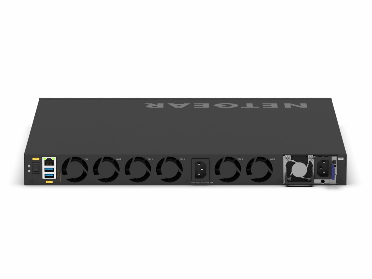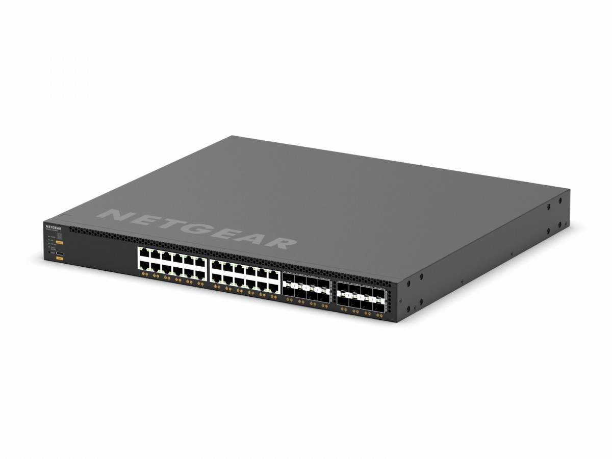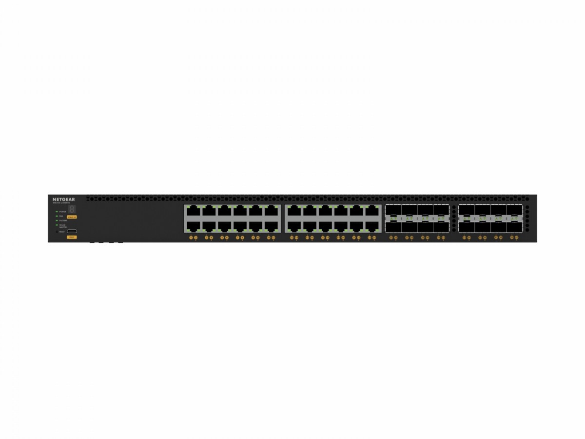 Przełącznik zarządzalny 24x10G/Multi-Gig PoE++ (podstawa 290 W, do 1770 W), 8xSFP+ i 8xSFP28 25G. 24 porty 10G/Multi-Gig PoE++, 8 portów 10GBASE-X SFP+ i 8 portów 25GBASE-X SFP28 Wewnętrzny zasilacz 750W zapewnia 290W budżetu PoE Jedno gniazdo do zasilania modułowego (redundancja 1+1 i/lub udział EPS) Można użyć dowolnego APS600Wv3, APS1200Wv2 lub APS2000Wv2 Budżet PoE może osiągnąć 1 770W, gdy nadmiarowy budżet PoE pozostaje 290W. Układanie wirtualnych obudów zapewnia nieprzerwane przekazywanie (NSF) i bezbłędne przełączanie awaryjne Zestaw funkcji warstwy 3 zawiera routing statyczny, oparty na zasadach i dynamiczny Netgear IGMP Plus, interfejs użytkownika AV i kontroler włączania przyspieszają instalację AV