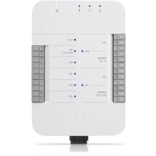 Pozostałe parametry: Przekaźniki zasilane 12V i suche kompatybilne z większością zamków Cztery wejścia dla czujników ruchu, urządzeń od żądania do wyjścia Zarządzane za pomocą kontrolera dostępu UniFi w UDM-Pro Montaż na szynie DIN