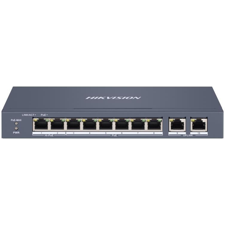 8-portowy inteligentny przełącznik POE Fast Ethernet 8 × porty 100 Mbps PoE RJ45, 2 × gigabitowe porty sieciowe RJ45 Standard IEEE 802.3at/af/bt dla portów PoE Zarządzanie topologią sieci i wysyłanie alarmów Ochrona przeciwprzepięciowa 6 KV dla portów PoE Transmisja dalekiego zasięgu do 300 m Kamera AF/AT może osiągnąć zasięg do 300 m w trybie rozszerzonym