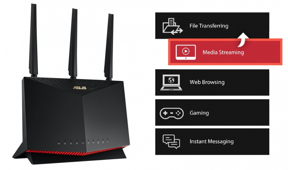 Z dwuzakresowym routerem ASUS RT-AX86U Series pracującym w standardzie Wi-Fi 6 będziesz cieszyć się szybszymi i bardziej płynnymi połączeniami gamingowymi niż kiedykolwiek wcześniej. Zapewnia on ultraszybką łączność bezprzewodową z prędkościami sięgającymi 5700 Mb/s, a ponadto jest po brzegi napakowany zaawansowanymi technologiami. Oferuje m.in. tryb rozgrywki mobilnej, który gwarantuje doskonałe wrażenia podczas mobilnego gamingu przy niskiej latencji i bez opóźnień.