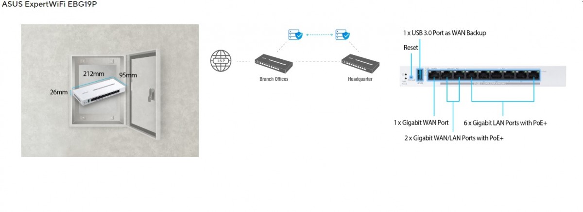 Kompaktowy ExpertWiFi EBG19P o wymiarach 212 x 95 x 26 mm mieści się w skrzynce okablowania niskiego napięcia. VPN typu site-to-site umożliwia bezpieczne połączenia i udostępnianie zasobów pomiędzy lokalizacjami. Dzięki dwóm portom WAN/LAN i portowi USB do tworzenia kopii zapasowych zapewnia stabilną łączność.