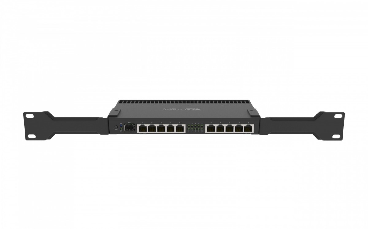 RB4011iGS+RM (model Ethernet) zawiera dwa ucha do montażu w racku, które bezpiecznie przymocują urządzenie w standardowej przestrzeni rack 1U.