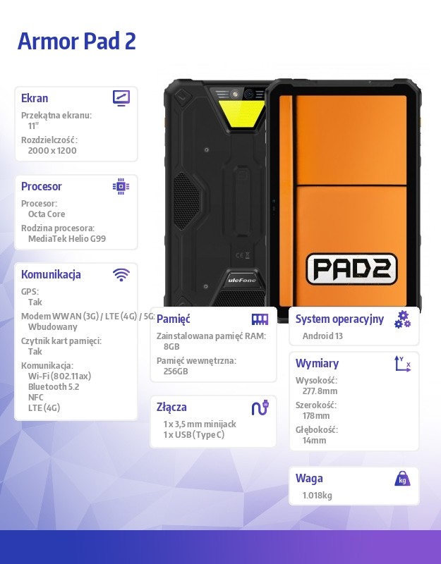 Armor Pad 2 posiada 8-rdzeniowy procesor o taktowaniu do 2,2 GHz i procesor graficzny ARM Mali-G57 MC2, który jest energooszczędny i zapewnia płynne działanie we wszystkich aplikacjach i grach.