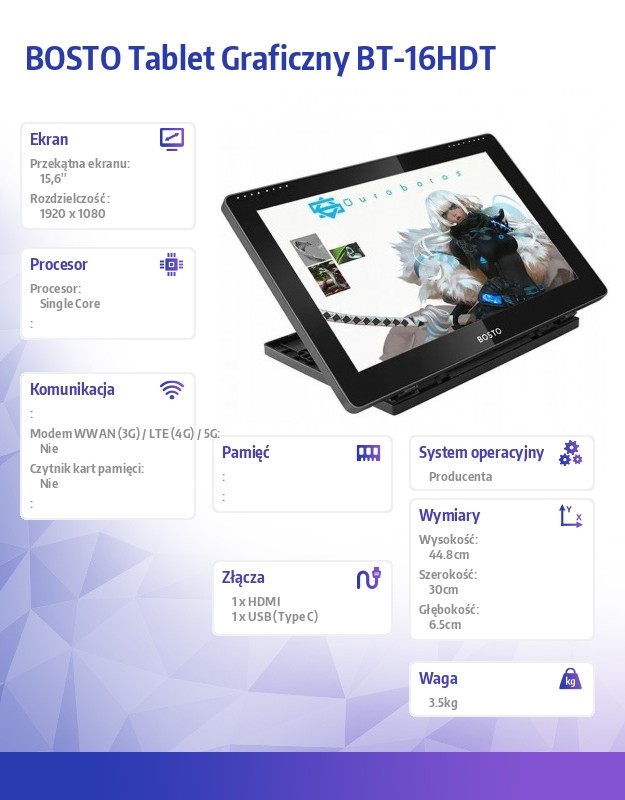 Tablet graficzny BOSTO BT-16HDT to tablet z ekranem LCD. To urządzenie przeznaczone do tworzenia grafik cyfrowych. Przydaje się także podczas nauki, robienia notatek, prowadzenia prezentacji czy wykładów. Jak sama nazwa wskazuje tablet posiada wyświetlacz. Efekty pracy są widoczne pod ręką na ekranie tabletu oraz komputera. Tablet do pracy potrzebuje ciągłego podłączenia do komputera.