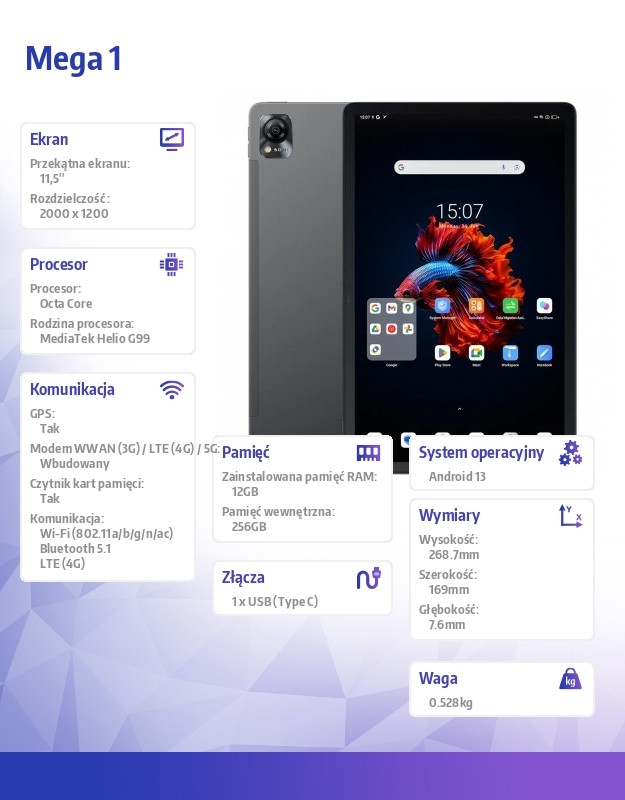 Tablet Mega 1 11.5 cala 12/256GB 8800 mAh szary