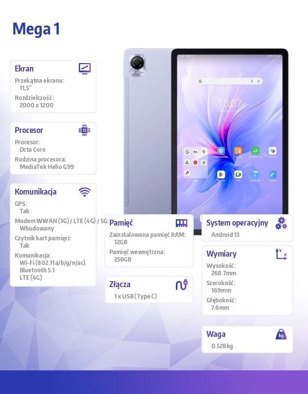 Tablet Mega 1 12/256GB 8800 mAh 11.5 cala purpurowy