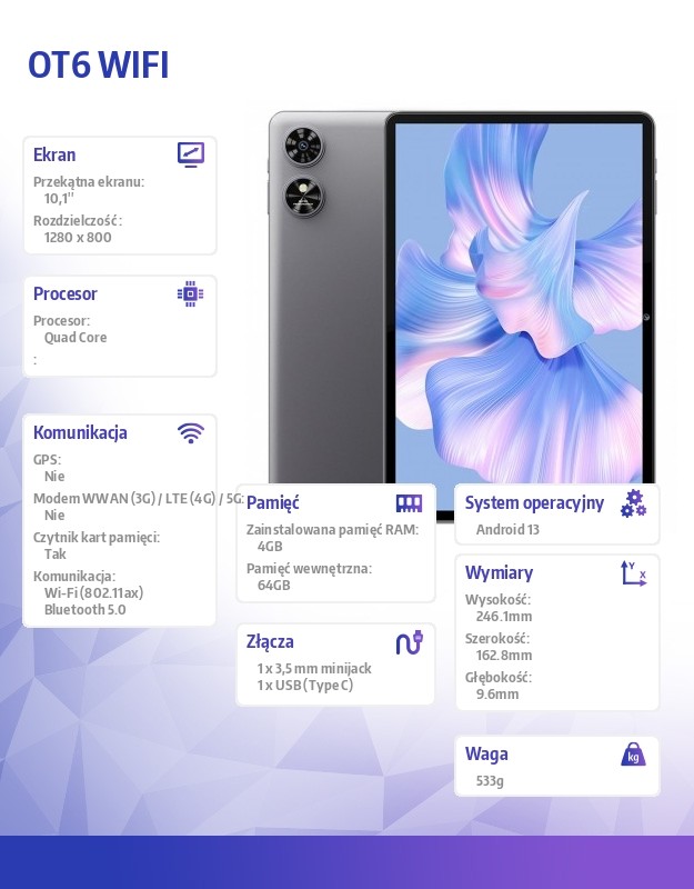 Ekran tabletu Oukitel OT6 wyróżnia się przekątną 10,1 cala oraz rozdzielczością 1280 x 800 pikseli, co zapewnia wyraźny...