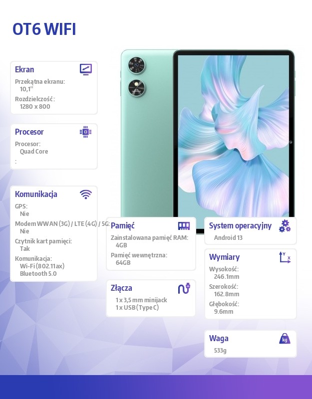 Ekran tabletu Oukitel OT6 wyróżnia się przekątną 10,1 cala oraz rozdzielczością 1280 x 800 pikseli, co zapewnia wyraźny...