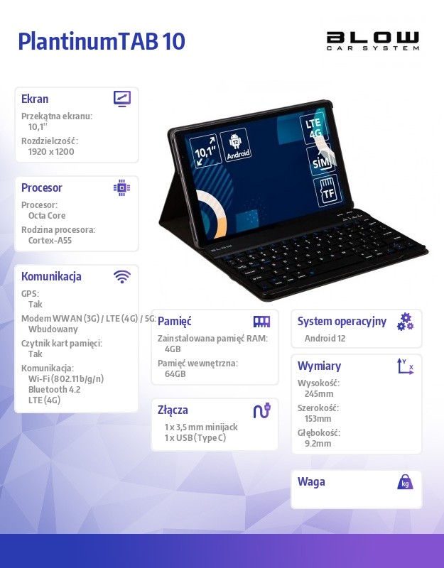 Akcesoria w zestawie: Tablet Blow PlatinumTAB10 V22 4G LTE Etui z klawiaturą Bluetooth Ładowarka Kabel USB typ C Instrukcja w języku polskim