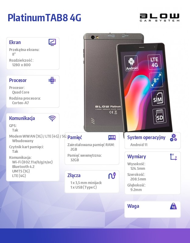 Akcesoria w zestawie: Tablet BLOW PlatinumTAB8 Ładowarka sieciowa + kabel USB C: 80cm Przejściówka z USB A (gniazdo) na USB C (wtyk): 15cm Instrukcja w języku polskim Pudełko