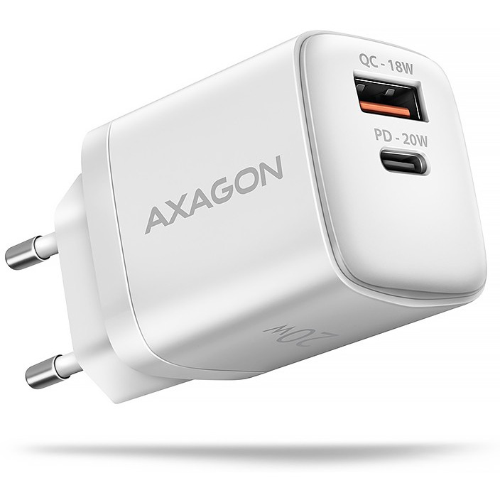 Kompaktowa ładowarka sieciowa AXAGON ACU-PQ20W umożliwia szybkie ładowanie aż dwóch u urządzeń mobilnych jednocześnie. Dzięki mocy całkowitej 20W ładowarka potrafi ładować telefony, tablety i inne urządzenia mobilne z najwyższą możliwą prędkością. Adapter oferuje standardowe złącze USB-A, ale także dwustronne złącze USB-C.