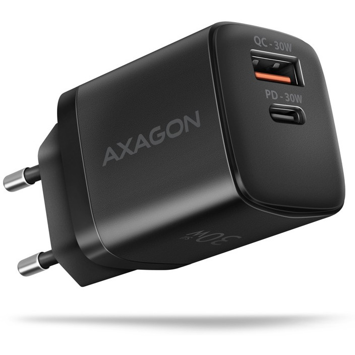 Kompaktowa podróżna ładowarka do sieci. AXAGON ACU-PQ30 Sil do szybkiego ładowania do dwóch urządzeń mobilnych jednocześnie. Dzięki mocy całkowitej 30W ładowarka potrafi ładować telefony i inne urządzenia mobilne z najwyższą możliwą prędkością. Adapter oferuje standardowe złącze USB-A, ale także dwustronne złącze USB-C.
