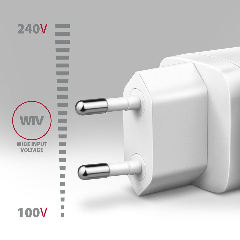 Ładowarka wspiera funkcje WIV, AIC, CV/CC: Wide Input Voltage - funkcja szerokiego zakresu napięcia wejściowego, chroni adapter przed podnapięciem i nadnapięciem na wejściu i umożliwia wykorzystanie większej ilości "narodowych standardów ładowania". Automatic Intelligent Communication - funkcja automatycznego rozpoznania urządzenia przyłączonego w celu wybranie optymalnych parametrów ładowania. Constant output Voltage / Constant output Current - funkcja utrzymywania stałego napięcia oraz stałego prądu zapobiega fluktuacji mocy wyjściowej, funkcja ta zapewnia stabilny przebieg ładowania.