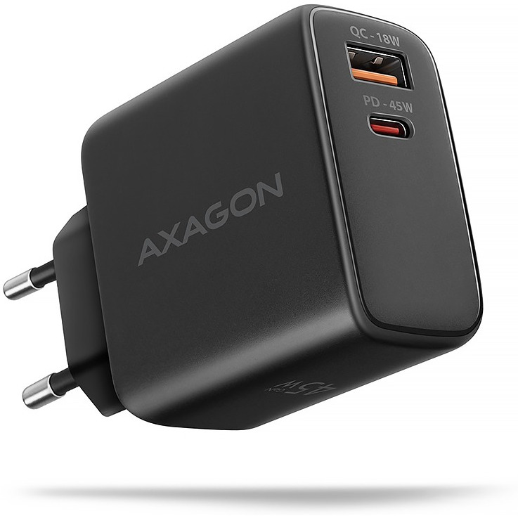 Podróżna ładowarka sieciowa AXAGON ACU-PQ45 GaN umożliwia szybkie ładowanie do dwoch urządzeń mobilnych jednocześnie. Dzięki mocy całkowitej 45W ładowarka potrafi ładować telefony, tablety i inne urządzenia mobilne z najwyższą możliwą prędkością. Adapter oferuje standardowe złącze USB-A, ale także dwustronne złącze USB-C.