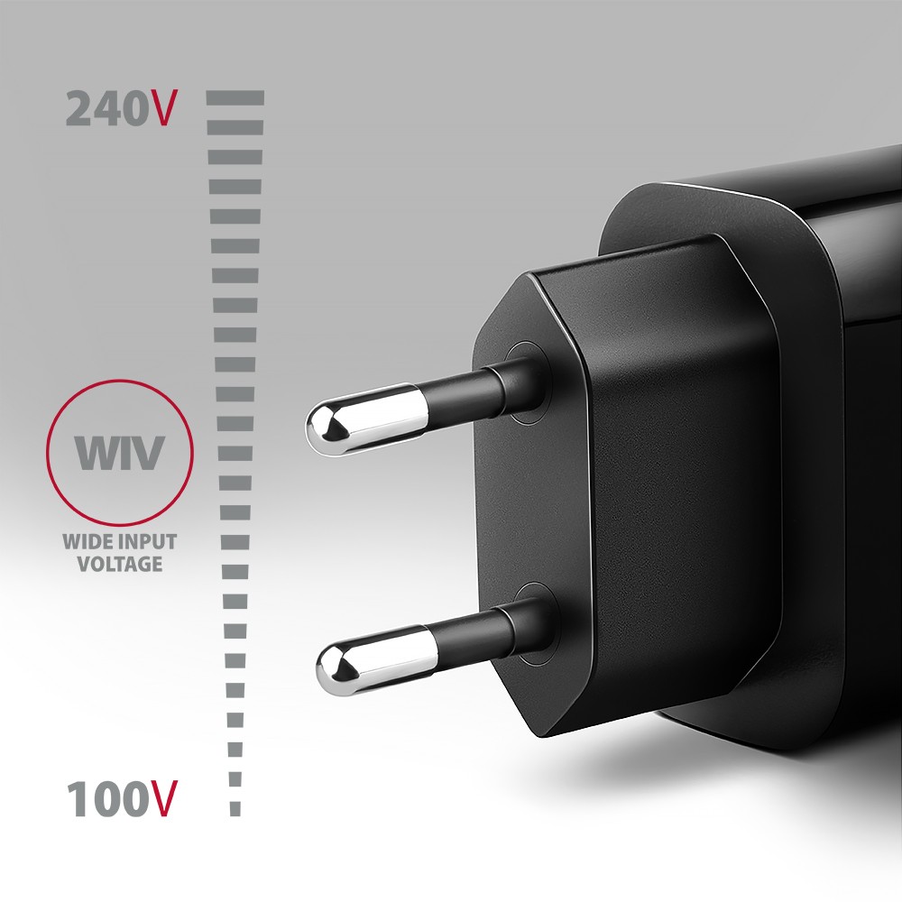 Wide Input Voltage - funkcja szerokiego zakresu napięcia wejściowego, chroni adapter przed pod napięciem i nadnapięciem na wejściu i umożliwia wykorzystanie większej ilości "narodowych standardów ładowania".