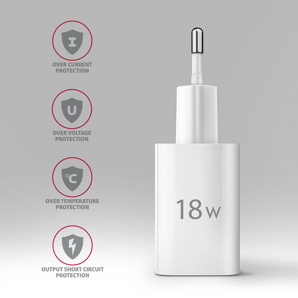 Ładowarka sieciowa USB AXAGON ACU-QC18W jest przeznaczona do ładowania urządzeń mobilnych. Dzięki mocy całkowitej 18W ładowarka potrafi ładować telefony, tablety i inne urządzenia mobilne z najwyższą możliwą prędkością. Adapter posiada standardowe złącze USB-A.