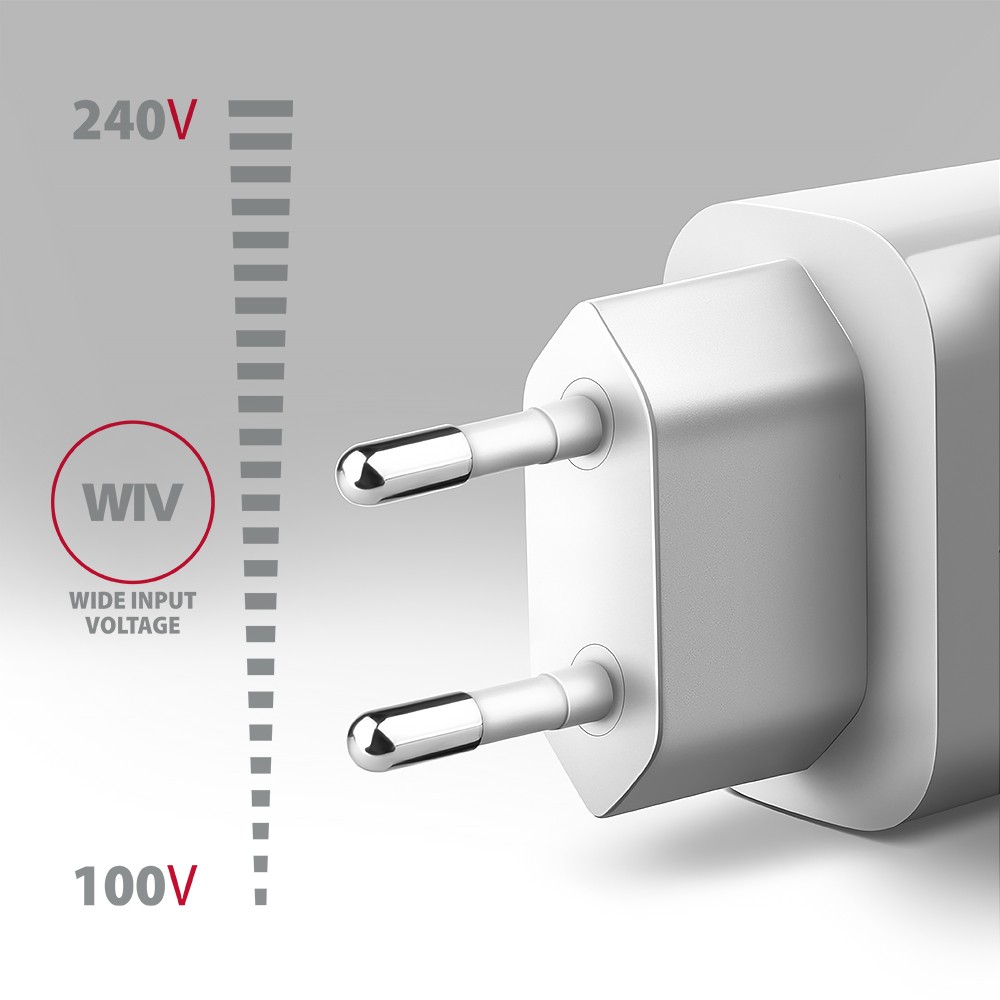 Wide Input Voltage - funkcja szerokiego zakresu napięcia wejściowego, chroni adapter przed pod napięciem i nadnapięciem na wejściu i umożliwia wykorzystanie większej ilości "narodowych standardów ładowania".