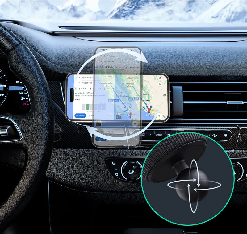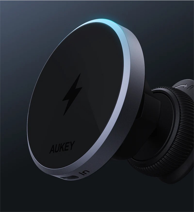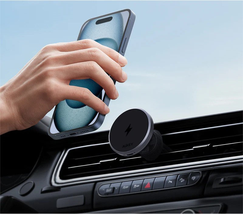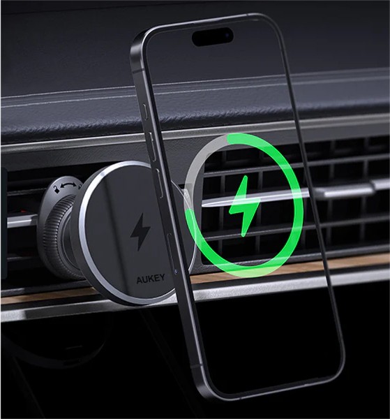 AUKEY HD-MC13 uniwersalny uchwyt magnetyczny z ładowarką bezprzewodową Qi2 15W do samochodowej kratki nawiewowej (BARDZO MOCNY) z dodatkowym zatrzaskiem + kabel AUKEY USB-C 1m Uchwyt na telefon AUKEY HD-MC13 MagSafe MagFusion Dash Qi2 z szybkim ładowaniem bezprzewodowym Certyfikat Qi2 - certyfikowany zgodnie ze standardem Qi2, co gwarantuje kompatybilność i niezawodne ładowanie urządzeń obsługujących Qi Szybkie ładowanie bezprzewodowe 15W - szybkie ładowanie bezprzewodowe o mocy 15W dla serii iPhone 15 i modeli z systemem iOS 17.2 lub nowszym Silne przyciąganie magnetyczne - zastosowano silne magnesy, zapewniające bezpieczne połączenie między urządzeniami i ładowarką Regulowany kąt widzenia - oferuje 360° regulowany kąt widzenia, dostosowany do indywidualnych preferencji użytkownika Bezpieczny system mocowania haka wentylacyjnego - zapewnij pewny i stabilny chwyt na nawiewniku w samochodzie. Ciesz się jazdą bez obaw, ponieważ telefon pozostaje bezpiecznie zamocowany, nawet na wyboistych drogach. Solidność i trwałość - metalowa podstawa i wykończenie lakierem klasy premium gwarantują solidność i trwałość, a jednocześnie dodają odrobinę elegancji