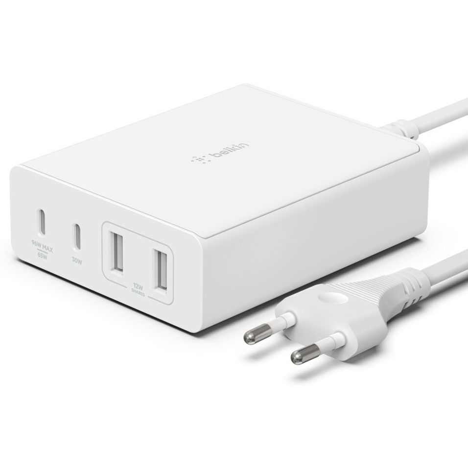 Zawiera zintegrowaną technologię GaN, która zapewnia bezpieczne i wydajne ładowanie przy dużej mocy. 108 W łącznej mocy do ładowania do 4 kompatybilnych urządzeń przez porty 2x USB-C i 2x USB-A.