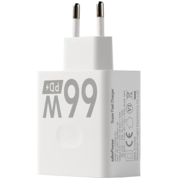 Ładowarka Ulefone 66W (biała) Napięcie 5V, 9V, 12V, 15V, 20V Pobór mocy : 66W Złącze 1 x USB-C Kolor : biały Kompatybilność : Ulefone lub inne urządzenia z wejściem USB C