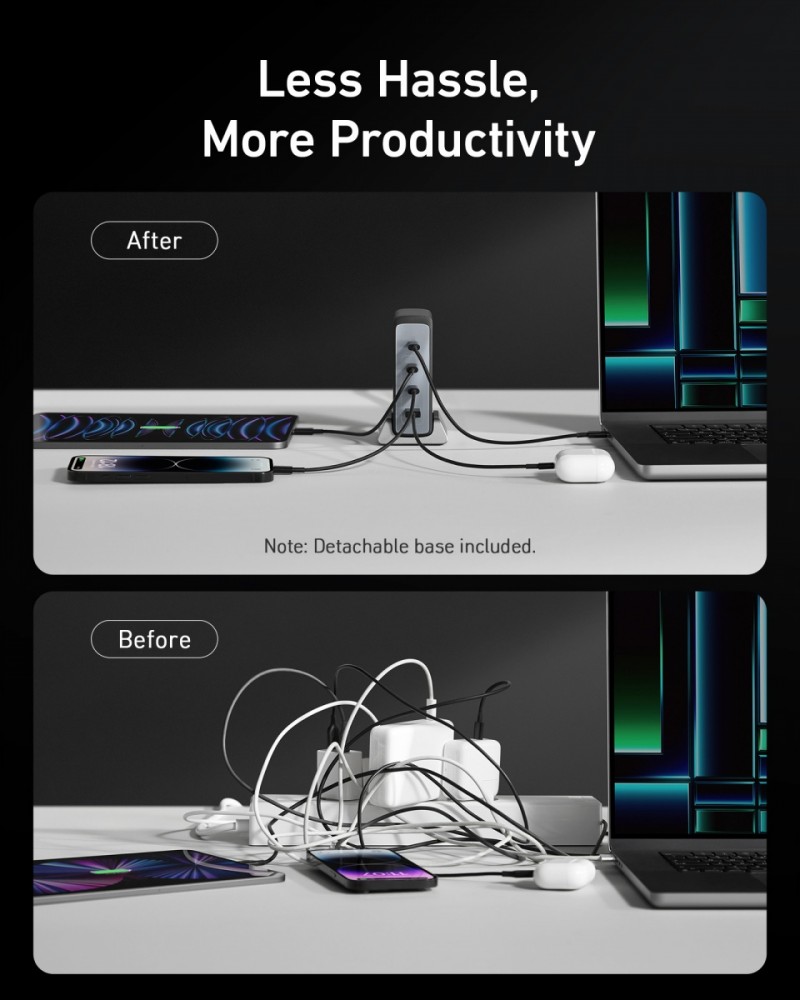 Super moc 240 W: jeden port USB-C zapewnia moc do 140 W, a pozostałe trzy porty pozostałe 100 W, można ładować jednocześnie 4 urządzenia z maksymalną mocą 240 W. Zapewnia zasilanie dwóch laptopów jednocześnie, przy czym port USB-C 1 zapewnia moc 140 W, a port USB-C 2 zapewnia moc 100 W.